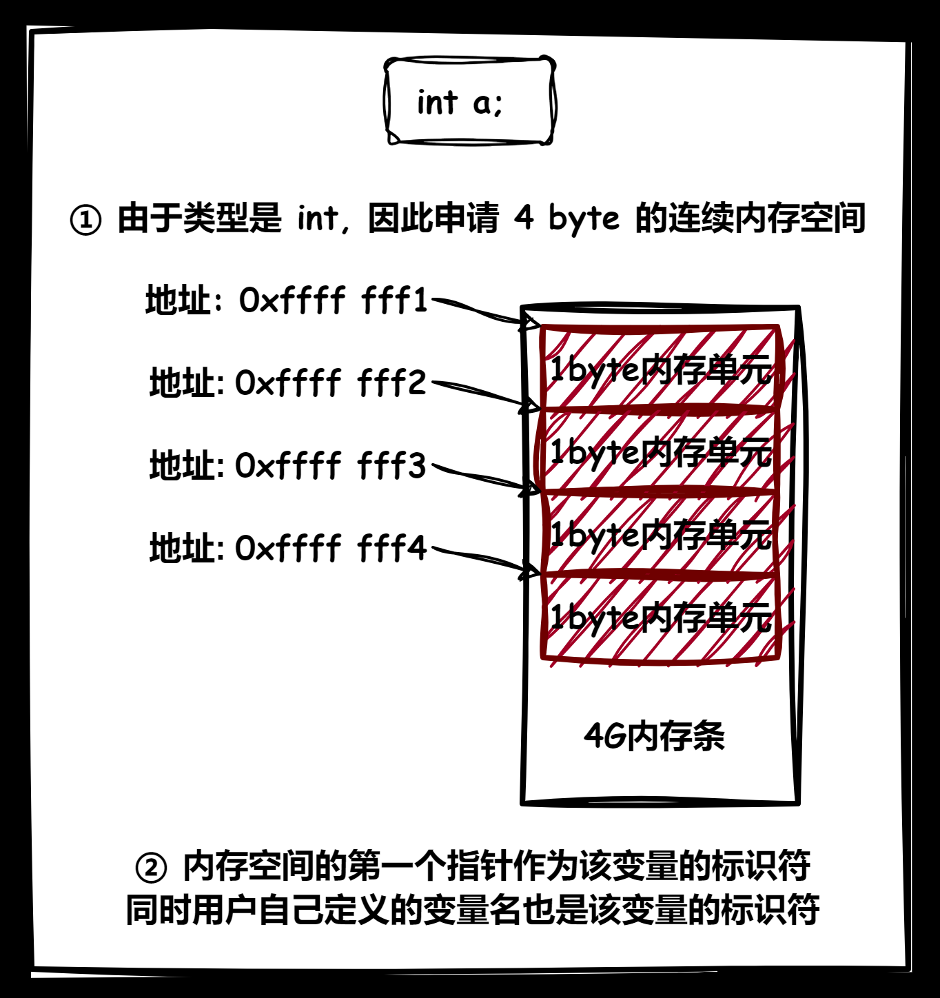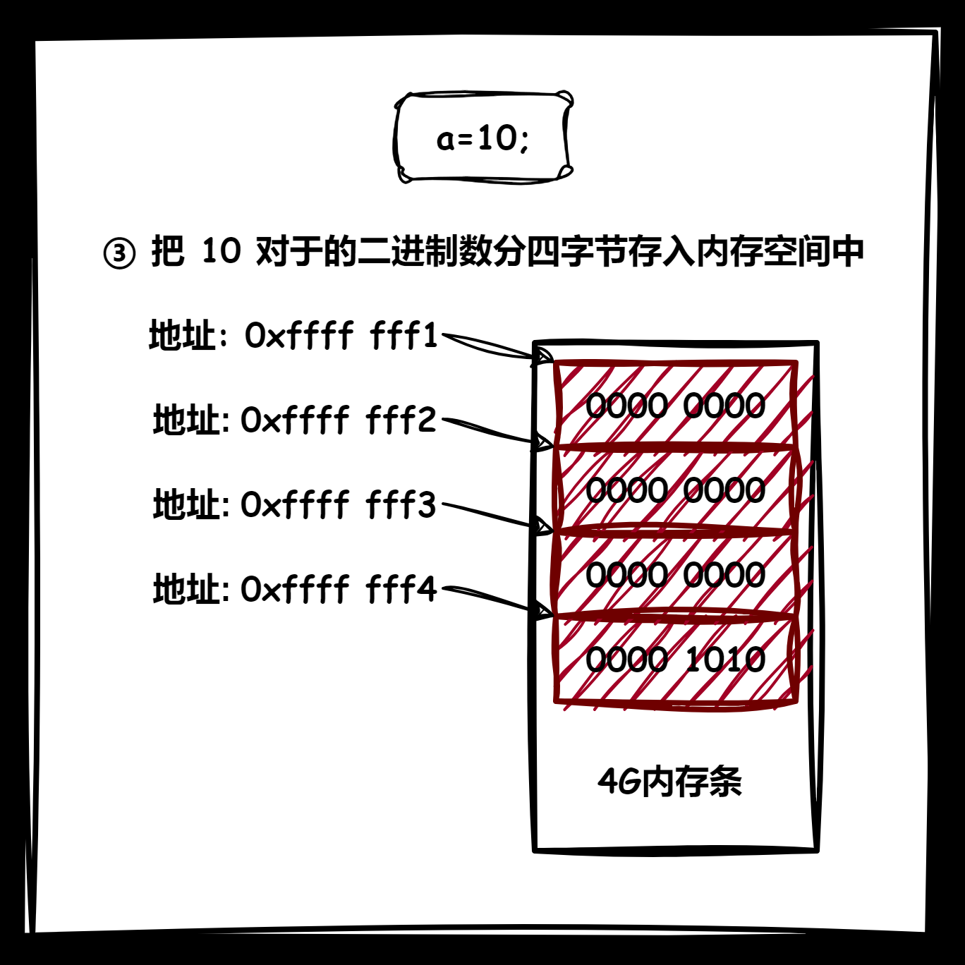此时我们就可以更深刻理解 int a = 10 的含义:向内存申请 4 个字节的空间,存储 10 这个值。