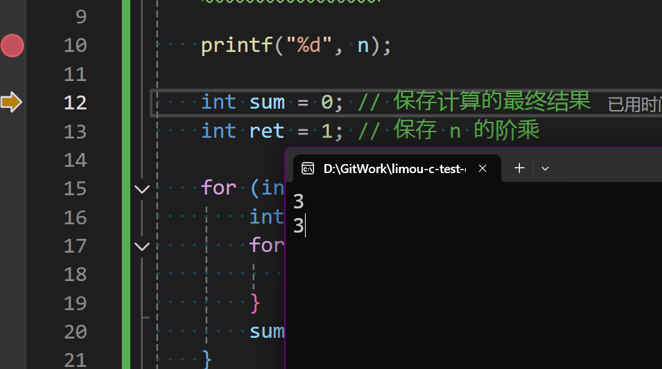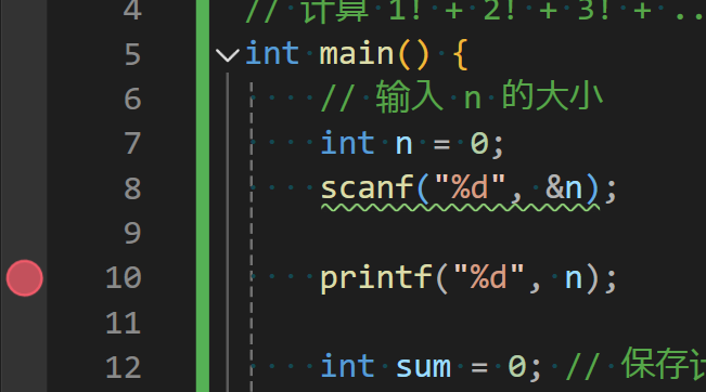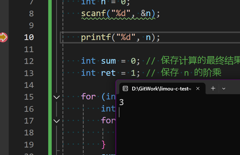 }先使用 printf() 打印以下读取到的 n 值是否正常,并且打上断点。使用快捷键 [F5] 打开 debug 模式,会一直跳转到 printf() 代码的执行(但是由于 scanf() 需要读取一个数才能一次性走到 printf())。