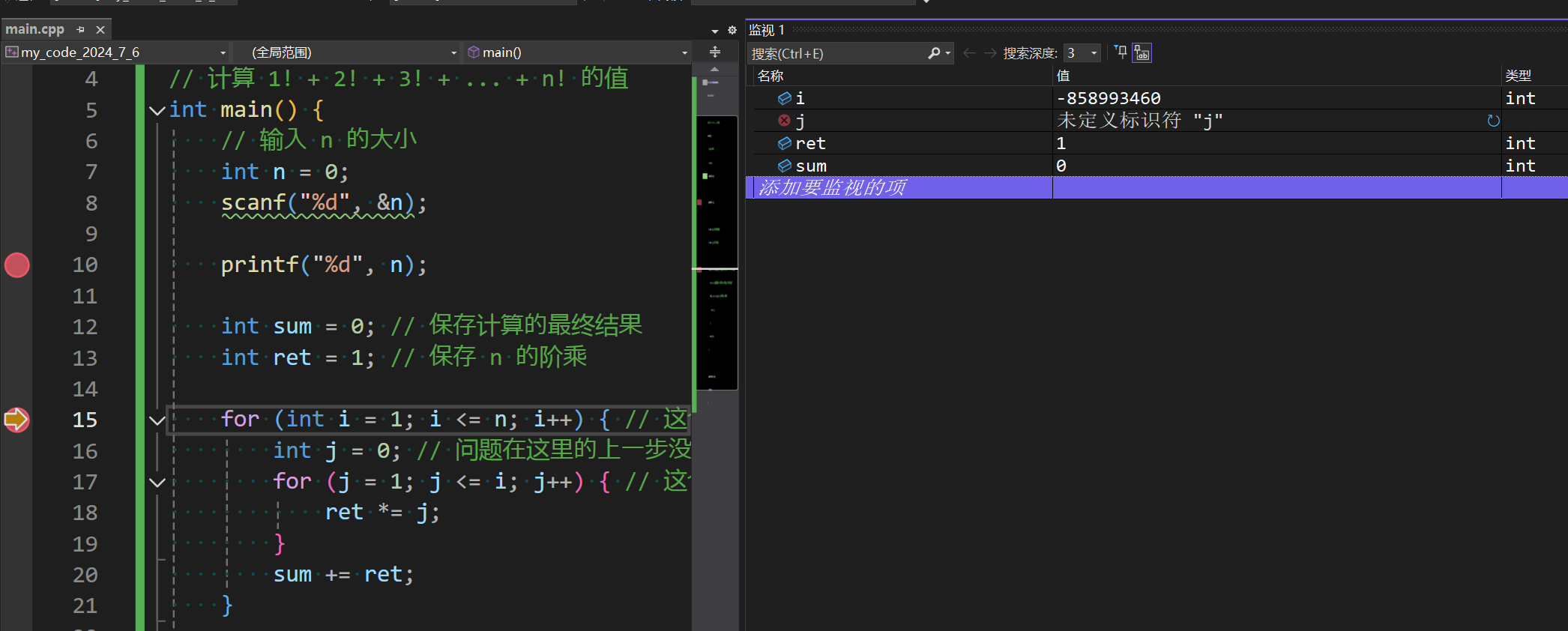 再考虑在循环处打一个断点再执行 [F5] 走到 for 之前的代码处。代码的主要逻辑就在循环这里,因此很可能在这里出错。然后把之前检查的 n 项去除(选中然后使用 [delete] 即可去除),并且把之前测试 n 用的 printf("%d", n) 也删除掉,重新添加 i, j, ret, sum 四个变量的检查项。