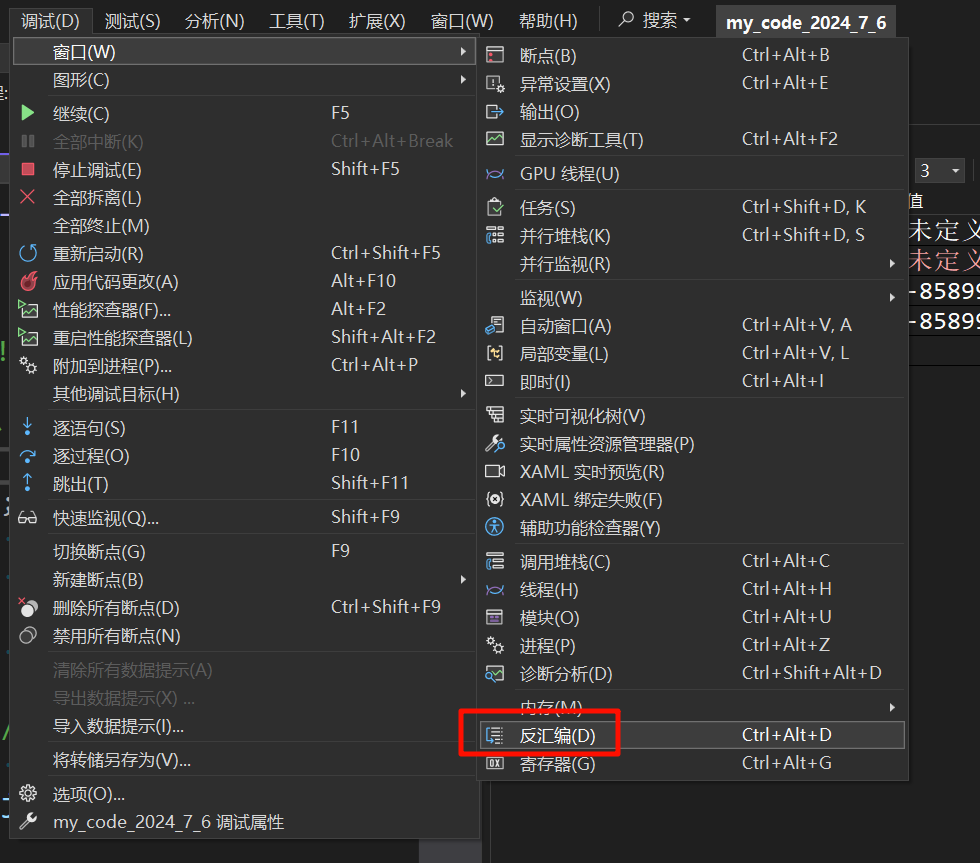 调试模式开始之后右键代码编辑窗口,选择“转到反汇编”,或者再调试状态下打开反汇编窗口,查看汇编代码通常也是在和硬件打交道较多的场景中使用,本系列中有机会再使用...