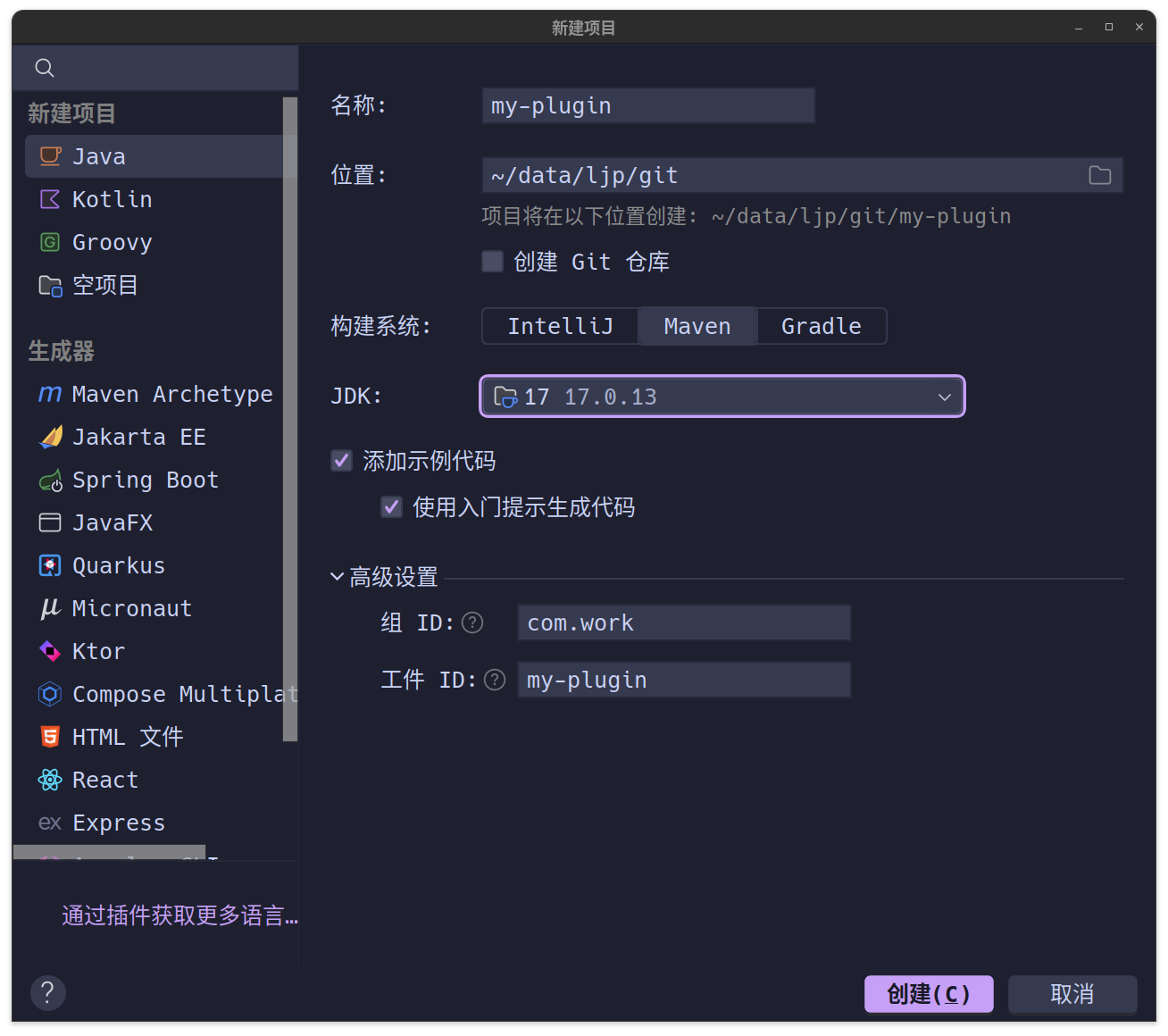 首先,您需要一个自定义 Maven 插件 my-plugin,还是像之前一样构建一个项目后,定义我们的 pom.xml。